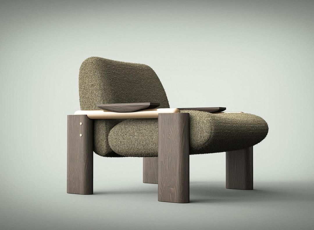 Title :EDEN Armchair: Modern Elegance in Wood and Dark Green Upholstery